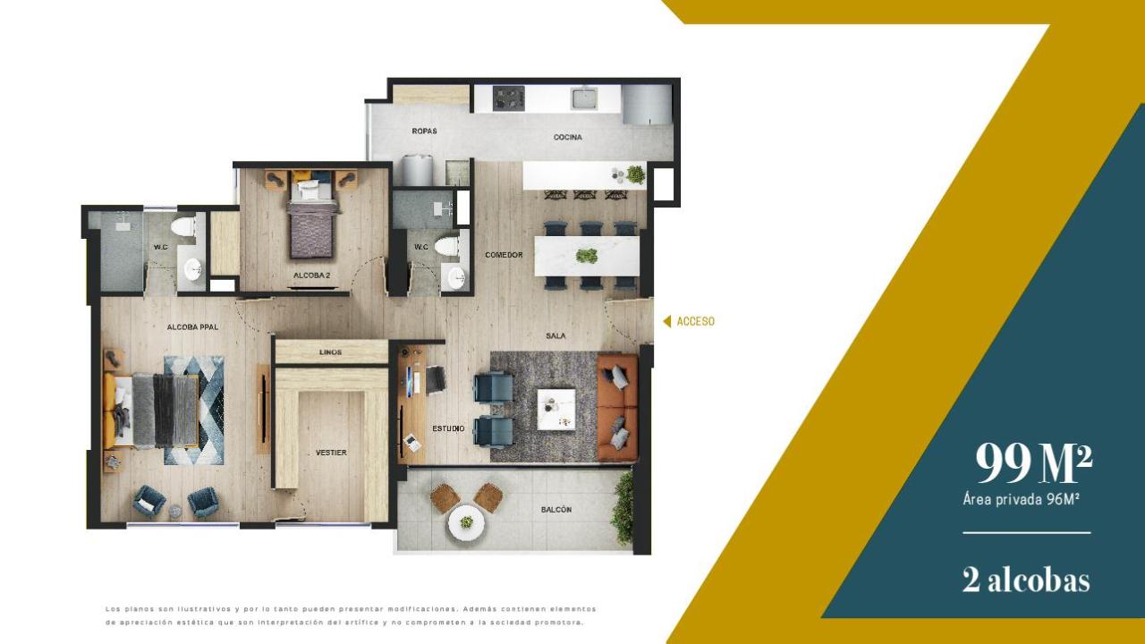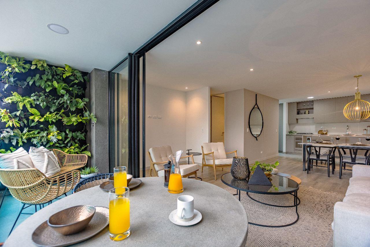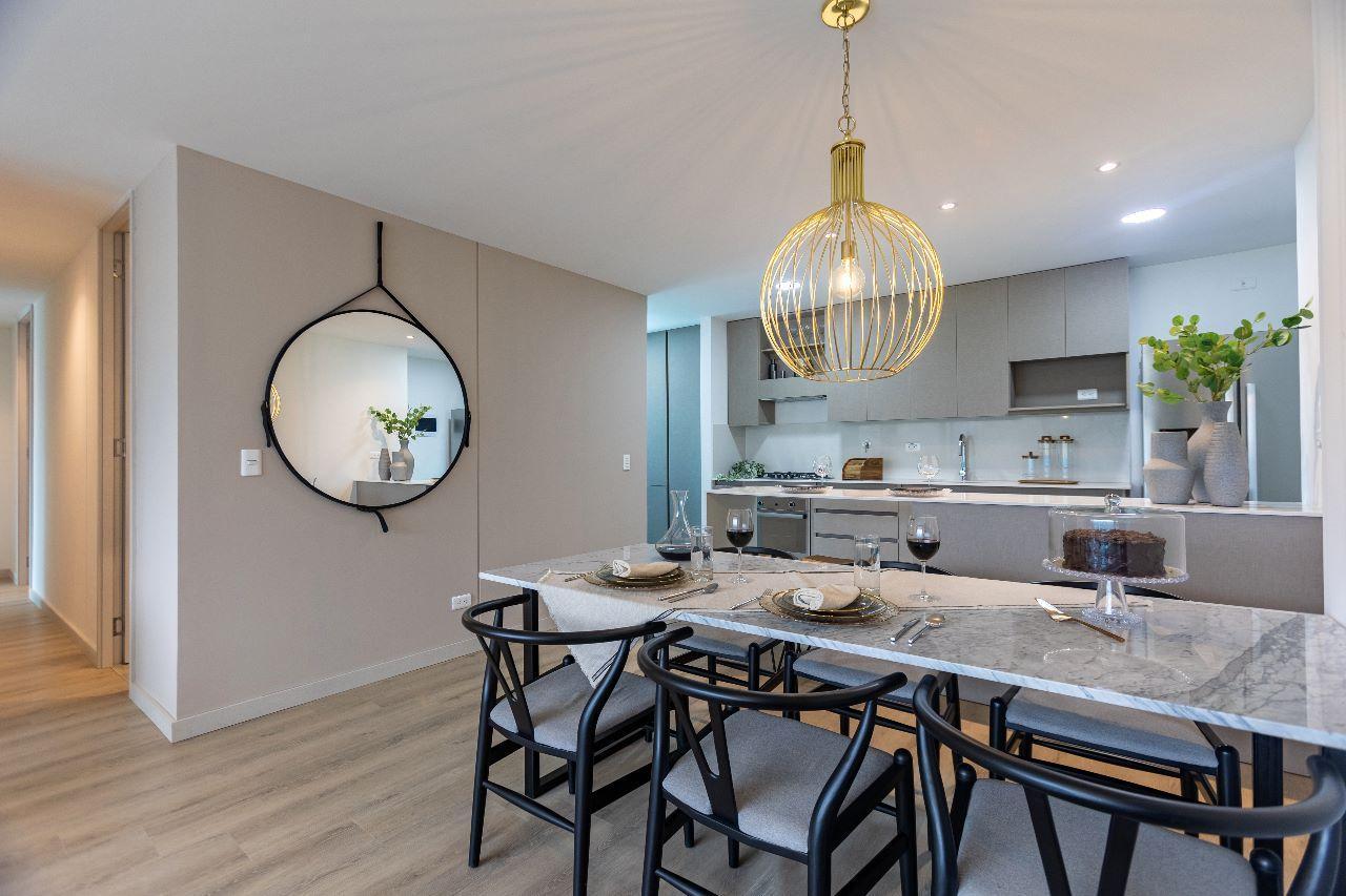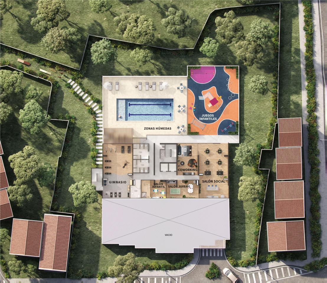 Las imágenes utilizadas son representaciones digitales del diseño y junto con los apartamentos y casas modelo pueden variar en la construcción final. El mobiliario, electrodomésticos, gasodomésticos, acabados y demás elementos que aparecen en las imágenes del apartamento o casa modelo son una representación a fin de ilustrar la utilización de los espacios y pueden diferir de lo entregado o no ser entregado según lo convenido en los contratos. Las áreas privadas y construidas podrán sufrir ajustes y quedarán finalmente determinadas en los contratos suscritos por las partes. Las zonas comunes serán entregadas por etapas según la programación de construcción.